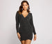 Wrap yourself in a glam mini dress that brings the glow to your next GNO! The dress features a wrap V-neckline. long sleeves. and a mini length silhouette with a ruched envelope hem. Complete your look with silver heels.