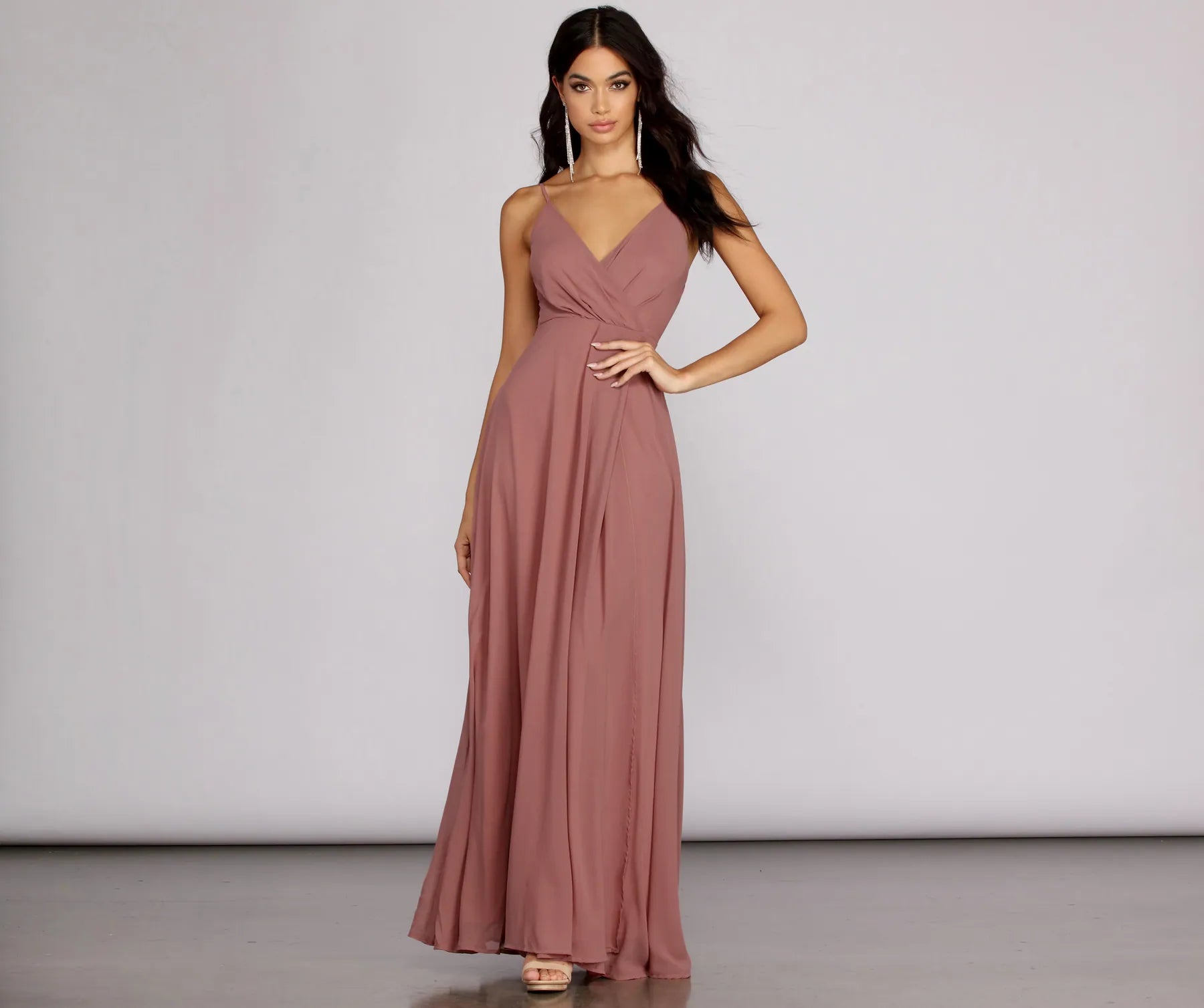 Elegant and ethereal. our chiffon Yelena gown is simply stunning. She features adjustable spaghetti straps. a V neck surplice bodice. back zip with hook-and-eye closure. and a full. wrap-style skirt with front slit. Yelena is fully lined and made from a lightweight woven material with little to no stretch.