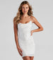 Bring the sparkle to your event with a formal bodycon that dazzles under the spotlight. Yelina features a pretty sequin pattern. sleeveless scoop neckline. bungee spaghetti straps. and a bold open back that is accented with bungee bar straps along her short. bodycon silhouette. The formal dress is composed of a sequin pattern mesh fabric with a knit lining and minimal stretch. Complete the look with rhinestone heels and a sphere clutch.