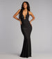 Bold. sculpted. and made for the spotlight — the Zaria formal gown turns every entrance into a slow-motion moment. Crafted in smooth stretch knit with a dramatic plunging halter neckline framed by metallic hardware. this gown cinches with soft ruching and finishes in a sleek mermaid silhouette.Â