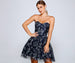 Step out in a formal dress that makes you feel like one in a million! Zariah features a strapless sweetheart neckline. a built-in no slip strip and padded cups. contrast piping with flexible boning in the bodice. a glitter floral pattern throughout. and a party-length skirt accented with hidden side pockets. The dress is composed of a lined mesh fabric with a petticoat and offers a fit and flare silhouette with minimal stretch. Complete the look with chrome heels and a clutch.