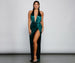 Dare to keep it bold and classy with a formal dress that stuns from the moment you enter the room! Zelia features a plunging halter neck. a bold open back. a high side slit with pleats. a wrap skirt. and a built-in bodysuit. The dress is composed of a satin fabric that offers a form-hugging fit with minimal stretch. Complete look with rhinestone heels and a sphere clutch.