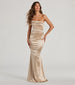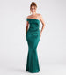 Wow them all with your chic allure in the elegant and sleek Zoey formal satin mermaid dress. She features an asymmetric one-shoulder neckline with an off-the-shoulder short sleeve. pleated detailing at the bodice and waist. a wrap overlay at the waist. a hip-hugging fit. and a floor-sweeping hem with a mermaid silhouette. The smooth satin-knit fabric offers a moderate stretch. Complete the look for your next formal affair with rhinestone statement earrings.